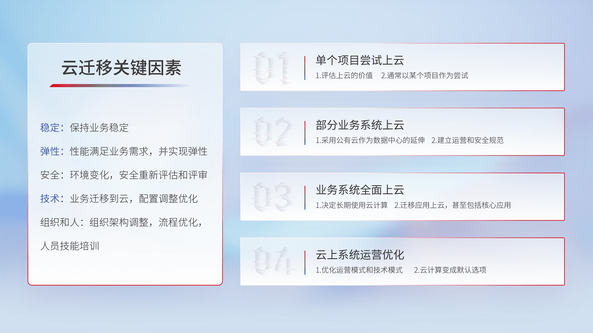 结合实际业务,,,,从规划设计、、、、云平台选型、、、云原生改造、、数据迁移、、、、集成交付,,,迁移全过程为客户识别最佳上云路径,,,做好风险识别管理,,,,设计网络架构、、、身份权限、、、、安全审计合规、、、操作审计、、日志审计、、、、监控告警策略、、、、多站点容灾设计等,,,对云上基础设施进行整体规划,,提升IT治理水平,,,以满足弹性、、、、高可用、、、高性能的需求。。
