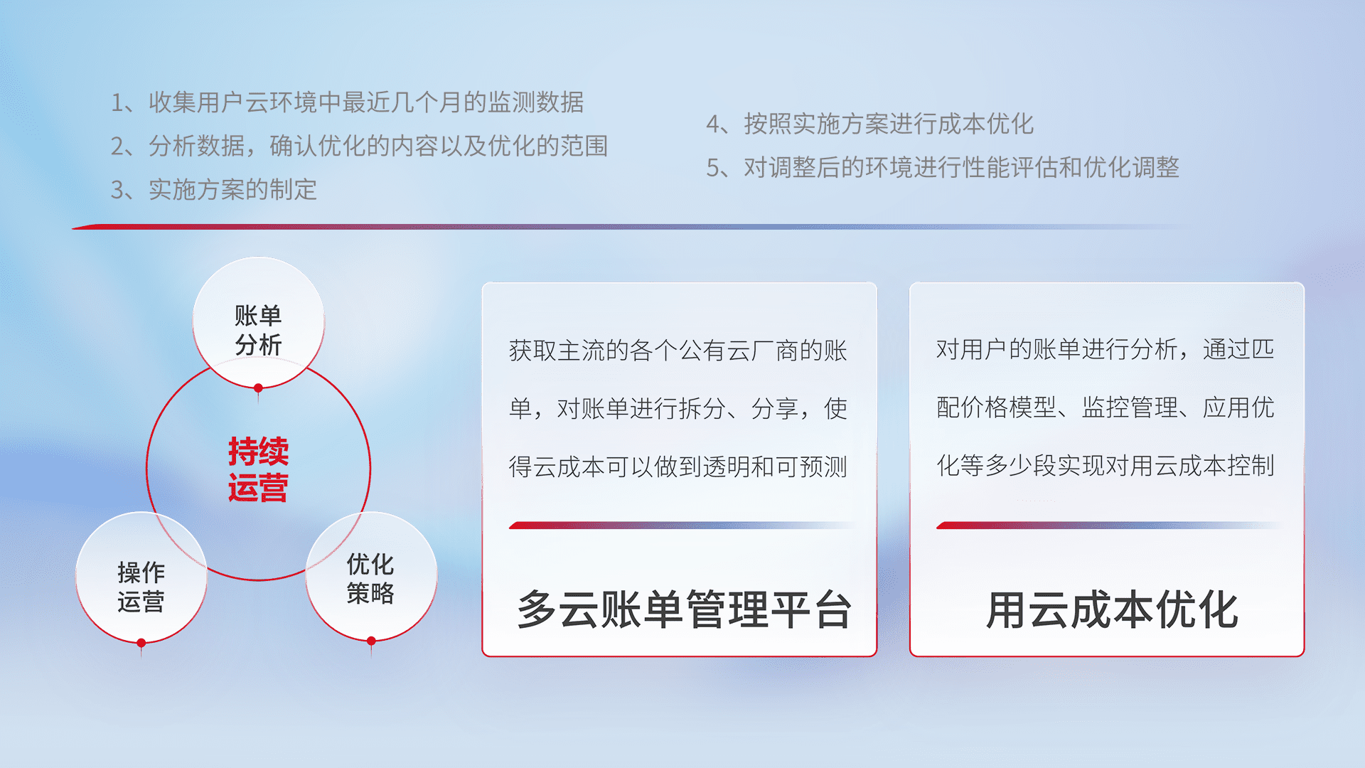 通过多云纳管,,,以统一的资源数据模型把客户的云资源进行抽象和封装,,,,进而实现对多云资源的统一操作,,保障云资源管理的可靠性、、、、稳定性与可用性。。。量身定制化运维内容,,,配置、、开发运维、、、、补丁管理、、、备份、、、、监控、、认证和访问管理、、、审计和日常巡检等,,,,保障在用云过程中的可靠度,,,稳定度以及高可用率。。。